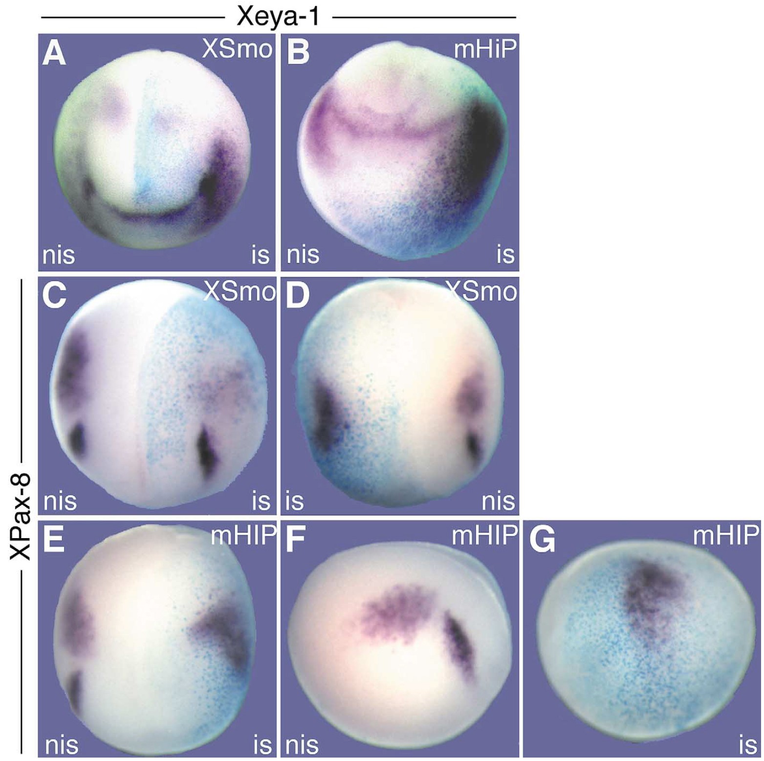 XSmo-injected embryo at the level of the optic vesicles. (D-G) XPax-2 expression (purple) in manipulated embryos detected by whole-mount in situ