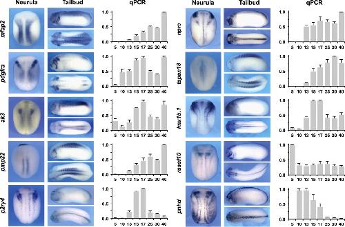Fig. 4. Developmental expression pattern of selected Pax3-Zic1 targets. The spatiotemporal expression pattern of 10 Pax3-Zic1 targets was analyzed by qPCR and whole-mount ISH. Expression levels of the target genes were analyzed by qPCR at the indicated stage (right panels). The values were normalized to odc and presented as mean±s.d. The data are an average of at least three sets of embryos. For ISH embryos were analyzed at the neurula (left panels; dorsal view, anterior to top) and tailbud (middle panels; lateral and dorsal views, anterior to the left) stages.