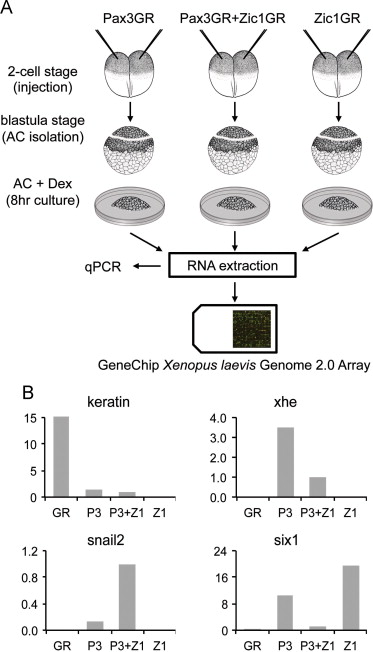 Fig. 1. Strategy to isolate Pax3-Zic1 targets: (A) procedures used to identify Pax3-Zic1 targets in the developing NC. Xenopus embryos were injected at the 2-cell stage with mRNA encoding GR (not shown), Pax3GR and Zic1GR (250 pg each), alone or in combination. At the blastula stage (stage 9), animal cap explants (AC) were dissected and cultured for 8 h in the presence of dexamethasone. RNA were extracted from each sample, analyzed by qPCR and subsequently used to screen a GeneChip Xenopus laevis Genome 2.0 Array (Affymetrix). (B) RNA extracted from GR, Pax3GR, Zic1GR, or Pax3GR+Zic1GR injected animal cap explants, were analyzed by qPCR for the expression of various marker genes, keratin (epidermis), xhe (HE), snail2 (NC), and six1 (PE) to confirm that the expected pattern of gene expression was observed in each injection group. The relative expression levels have been normalized to ef1α. P3, Pax3GR; Z1, Zic1GR.