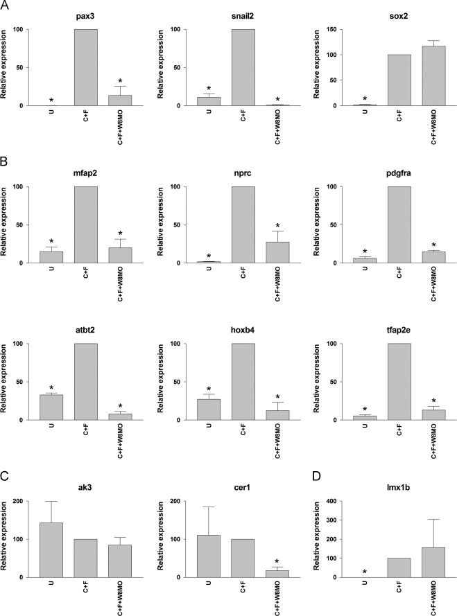 Fig. 3. Regulation of Pax3-Zic1 targets expression by NC-inducing signals: (A) in animal caps, induction of snail2 and pax3 by co-expression of Chordin (10 pg) and Fgf8a (5 pg) (C+F) is dramatically reduced in the context of embryos injected with Wnt8MO (W8MO; 50 ng). Interference with Wnt signaling pathway did not affect sox2 expression. (B) A majority of Pax3-Zic1 targets followed a pattern of activation in response to NC-inducing signals similar to that of snail2 and pax3, while a limited number of genes did not (C and D). The data are an average of at least three independent experiments. The values were normalized to odc and presented as mean±s.e.m.; (â), p<0.05 versus C+F.