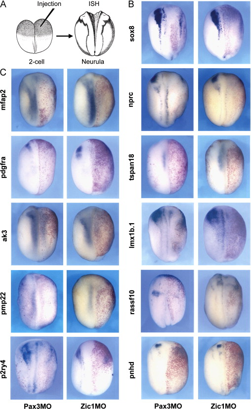 Fig. 5. Pax3 or Zic1 morpholino mediated knockdown blocked Pax3-Zic1 targets expression at the neurula stage: (A) Pax3MO (40 ng) or Zic1MO (40 ng) were injected in one blastomere at the 2-cell stage embryos. Embryos were collected at the neurula stage (stage 15â18) and analyzed by ISH (upper left). (B) ISH with a sox8 probe was used as a positive control for the activity of each morpholino. (C) The 10 Pax3-Zic1 targets analyzed showed reduced expression upon Pax3 or Zic1 knockdown. All panels are showing dorsal views, anterior to top. The injected side is on the right as indicted by the presence of the lineage tracer (red staining).