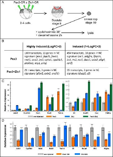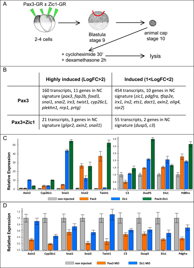 Fig. 3. Pax3 and Pax3/Zic1 immediate early target genes in the neural crest signature (A) Experimental strategy used to identify Pax3 and Pax3/Zic1 immediate early target genes. (B) List of direct targets belonging to the neural crest signature. (C) Independent validation of a subset of targets by quantitative PCR. Embryos were injected as indicated, either with Pax3GR mRNA, or Zic1GR mRNA, or a combination of both. The animal cap ectoderm was treated with cycloheximide and dexamethasone as described in the text. (D) In vivo validation of the novel Pax3/Zic1 target genes using by either Pax3 or Zic1 knockdown at stage 17. Abbreviations: Log FC, log 2 fold change.