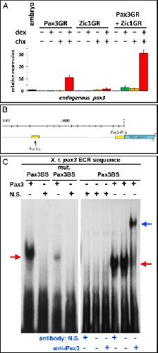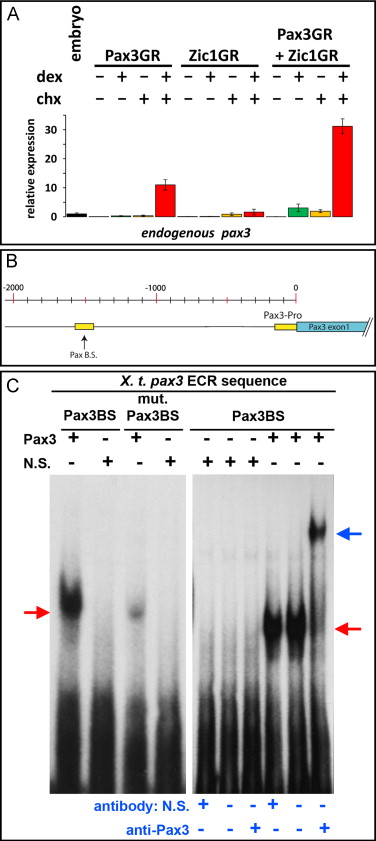 Fig. 5. Identification of Pax3 binding sites on Pax3 promoters in vitro (A) Pax3, but not Zic1 alone, can trigger synthesis of the endogenous Pax3 transcript (primers in 3'UTR, not amplifying the inducible form) either in absence of the translation inhibitor cycloheximide (induction is 5-fold compared to uninjected animal caps) or in the presence of cycloheximide (induction is 31-fold, compared to cycloheximide-treated uninjected animal caps). Endogenous pax3 expression level in a stage 11 whole embryo is set at a relative value of 1 unit. After co-injection of Pax3 and Zic1, endogenous pax3 was activated as an immediate-early target as well (77-fold compared to uninjected animal caps; and, in presence of cycloheximide, 16-fold when compared to cycloheximide-treated uninjected animal caps). (B) Location of the ECR containing Pax3 putative binding site in the genomic sequence upstream of the Pax3 TSS. (C) Pax3 binds specifically to the motif identified in the pax3 promoter ECR: an electrophoretic mobility shift of the radiolabeled Pax3 binding site (Pax3BS) oligonucleotide probe is detected in the presence of Pax3-transfected cell extract, but not with the GFP-transfected cell extract. Intensity of the shift is reduced when the Pax3 binding site is mutated (mut. Pax3BS). In the presence of a specific anti-Pax3 antibody, we detect a supershift, indicating that the Pax3 protein is indeed responsible for the observed shift.