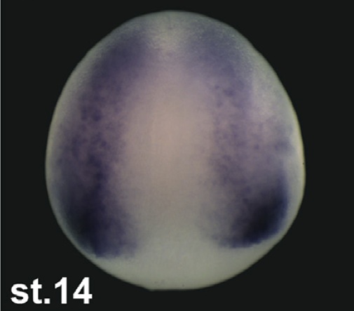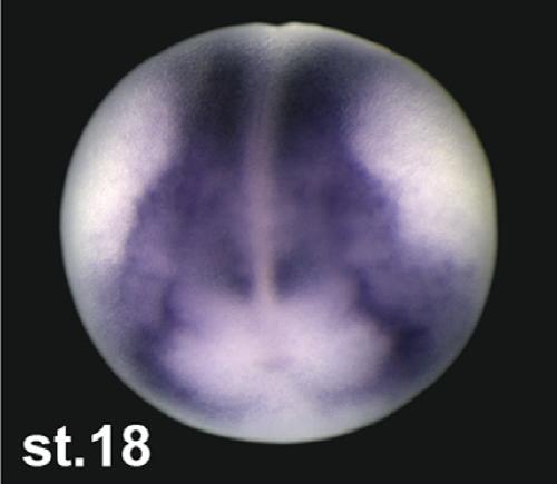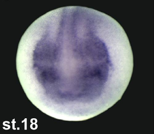 greb1l (growth regulation by estrogen in breast cancer-like) gene expression in Xenopus laevis embryo, assayed via in situ hybridization, NF stage 14, anterior view, dorsal up.