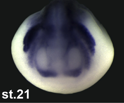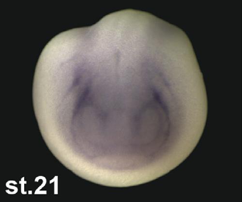 mfap2 (microfibrillar-associated protein 2) gene expression in Xenopus laevis embryo, assayed via in situ hybridization, NF stage 21, anterior view, dorsal up.