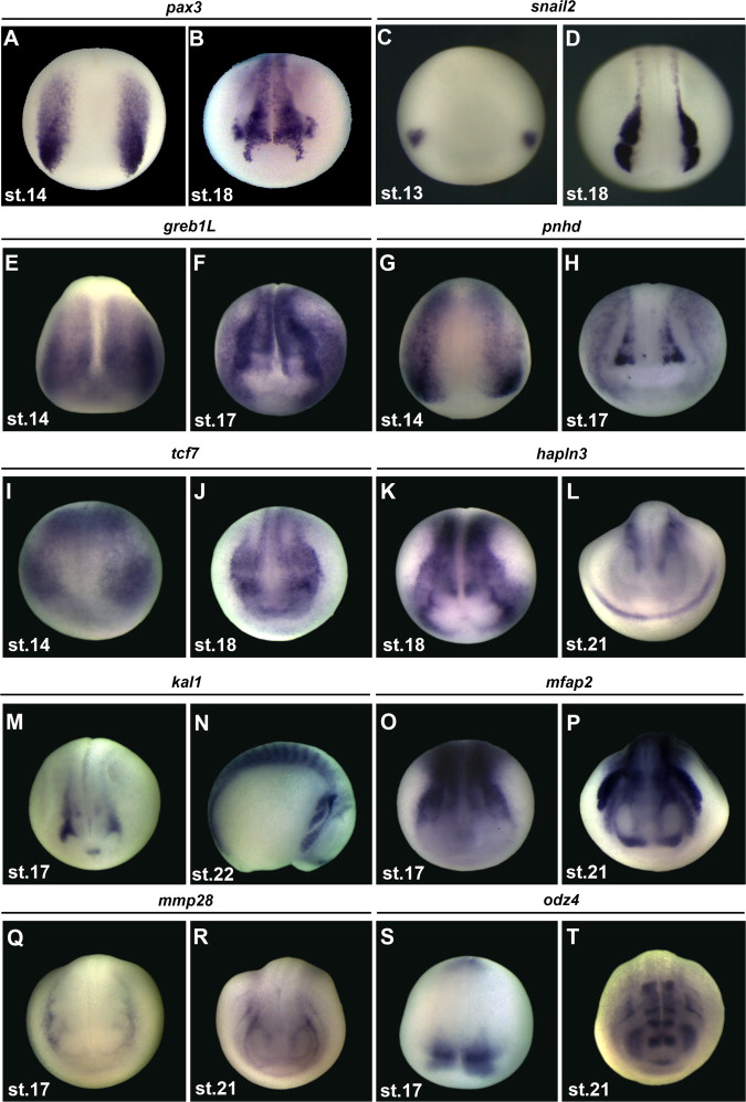 Fig. 2. Developmental expression of a sample of novel genes belonging to the neural border/crest signature Pax3 and snail2 serve as markers for the lateral neural border and the premigratory neural crest respectively. Novel markers, identified in the neural border/neural crest signature, are shown at the most significant stages. (A-M,O-T) Dorsal views, with anterior to the bottom and posterior to the top. (N) Side view.