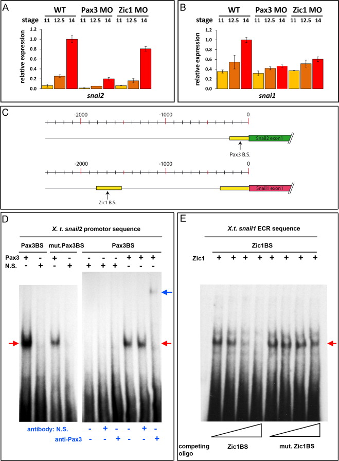 Fig. 4. Identification of Pax3 and Zic1 binding sites on Snail1/2 promoters in vitro (A) Induction of snail2 between stage 11.5 and 14 is strongly reduced by Pax3 knock-down, but only mildly affected by Zic1 knock-down. (B) The increase in snail1 transcription between stage 11.5 and 14 is blocked by both Pax3 and Zic1 knock-down. (C) Location of the ECRs studied here (yellow boxes), containing Pax3 or Zic1 putative binding site (B.S.), in the genomic sequence upstream of snail1 and snail2 transcription start site (TSS). (D) Pax3 binds specifically to the motif identified in the snail2 promoter ECR: the electrophoretic mobility of a radiolabeled oligonucleotide containing the putative Pax3 B.S. (Pax3BS) is shifted in the presence of Pax3-transfected cell extract, but not with the non-specific (N.S) control (i.e. GFP-transfected cell extract). Intensity of the shift is reduced when the Pax3 binding site is mutated (mut. Pax3BS). In the presence of a specific anti-Pax3 antibody, we detect a mobility supershift, indicating that the Pax3 protein is indeed responsible for the observed shift. (E) Zic1 binds specifically to the motif identified in the snail1 ECR: the electrophoretic mobility shift detected in the presence of Zic1-transfected cell extract can be competed by increasing doses of non-labeled oligonucleotide (Zic1BS), but only weakly by the mutated oligonucleotide (mut. Zic1BS).