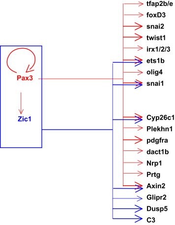 Fig. 6. Model of the Pax3/Zic1-linked neural crest gene regulatory network This model summarizes the targets of Pax3 and of Pax3 combined to Zic1, validated in this study. Red arrows indicate Pax3 targets, blue arrows indicate Zic1 targets. Bold arrows indicate that regulation by Pax3 or by Zic1 was confirmed by RTqPCR and/or in vivo.