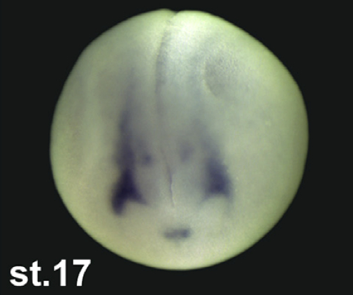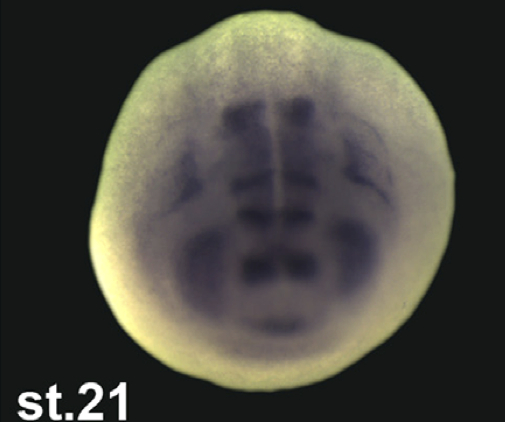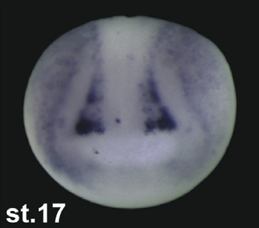 anos1 (anosmin 1) gene expression in Xenopus laevis embryo, assayed via in situ hybridization, NF stage 17, anterior view, dorsal up.