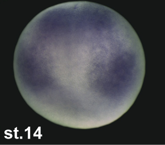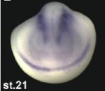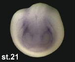 mmp28 (matrix metallopeptidase 28) gene expression in Xenopus laevis embryo, assayed via in situ hybridization, NF stage 21, anterior view, dorsal up.