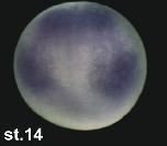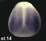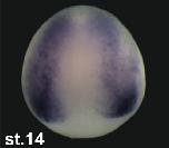 pnhd (pinhead) gene expression in Xenopus laevis embryo, assayed via in situ hybridization, NF stage 14, anterior view, dorsal up.