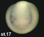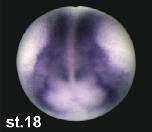 pnhd (pinhead) gene expression in Xenopus laevis embryo, assayed via in situ hybridization, NF stage 17, anterior view, dorsal up.