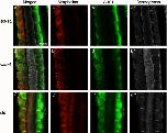Figure 9. Dystroglycan expression in sdf-1α and cxcr4 half morphants. Stage-26 (A) sdf-1α, (B) cxcr4, and standard (C) half-morphant embryos showing a merged imaged (MO-lissamine, 12/101 and dystroglycan). A'âB': Distribution of the lissamine-tagged MO. A''âB'': Immunolocalization of the muscle-specific marker, 12/101. A'''âB''': Images were converted to black and white to better visualize the distribution of dystroglycan on the morphant side in comparison to the control side. Scale bar in A applies to all frames. Anterior is at the top.