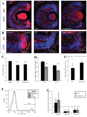 (D) Rapamycin treatment during stages 38-45 significantly reduced the number of proliferative cells in the CMZ. n=5-12 retinas. (E,F) ND or rapamycin reduced the fraction of G2/M cells that were EdU positive after a short EdU pulse (E), suggesting G2/M slowdown, and reduced the overall percentage of EdU- positive cells in the retina (F) from 13% in controls to 9% in rapamycin-treated and 7% in ND embryos. n=3 experiments. (G) Expression levels for the cell cycle genes cyclin D1, cyclin A2 and p27Xic1. ND and rapamycin expression levels are shown as ratio to control. n=6, 24 embryos/condition. (C-E,G) Error bars show 95% confidence intervals; ***Pâ¤0.001, *Pâ¤0.05 (unpaired t-test). Scale bars: 100 μm (A); 50 μm (B).