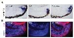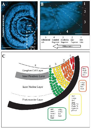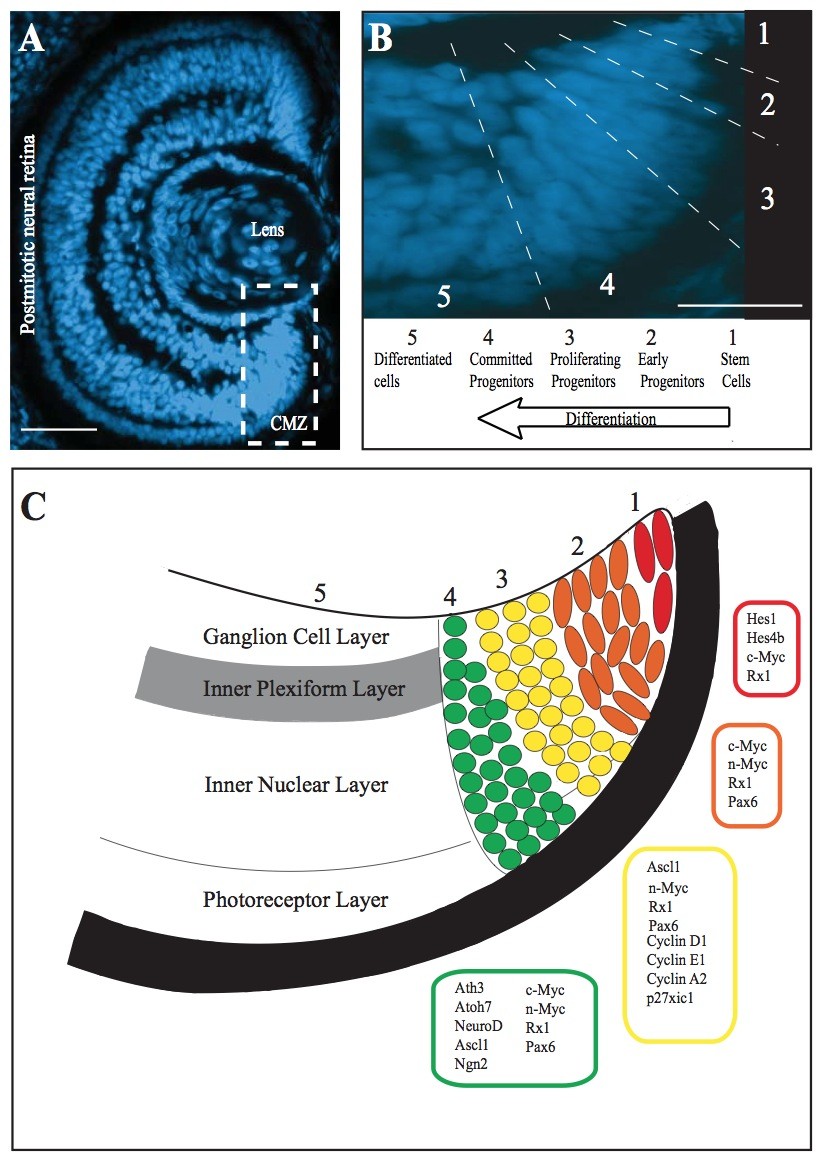 (A) DAPI labelled sagittal section through a stage 41 retina, showing the location of the Ciliary Marginal Zone (CMZ). (B) DAPI stained transverse section of the CMZ showing the spatial recapitulation of the temporal progression of neurogenesis. (C) Schematic representation of gene expression patterning in the CMZ of the stage 41 embryo. Scale bars: A = 100μm, B= 25μm