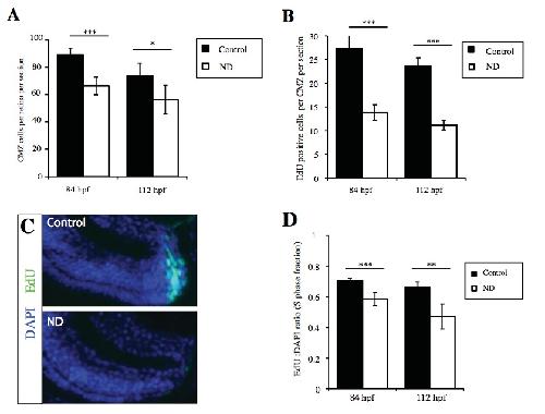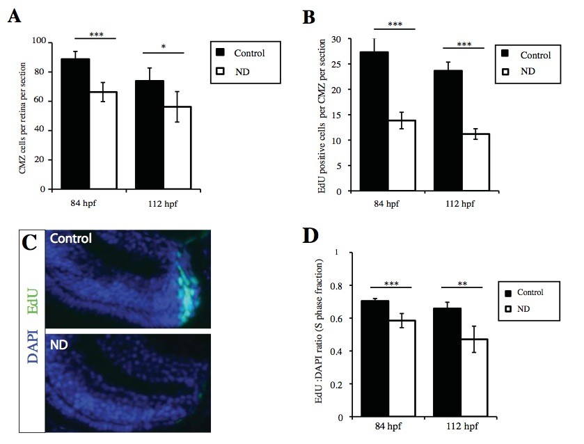 CMZ proliferation was significantly decreased in 84hpf and 112hpf nutrient deprived zebrafish at 56hpf. Nutrient deprived fish had fewer CMZ cells (A) and decreased EdU incorporation (B-C). (D) The proportion of CMZ cells that were EdU positive in S phase decreased suggesting cell cycle slowdown. Error bars show 95% C.I. Unpaired t test, n=9-29 retinas ***p=<0.001, **p=<0.01, *p=<0.05