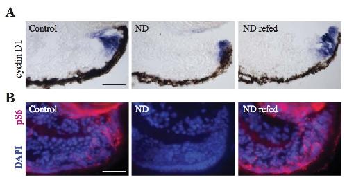 Fig. 4. Re-feeding promotes reconstitution of the CMZ. (A,B) Explanted retinas from ND embryos grown in L15 medium containing sugars and amino acids for 24 hours showed an increase in CMZ proliferation after a 2-hour pulse with EdU. n=3, 18 retinas/condition.
