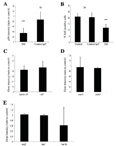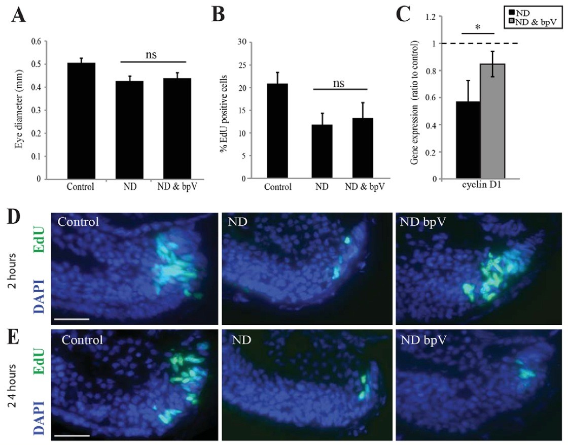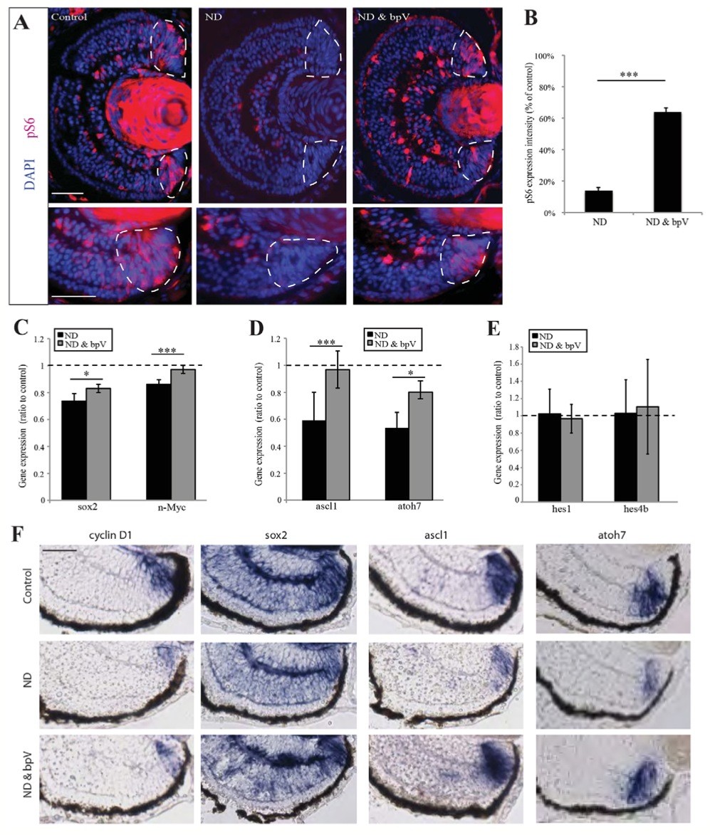 (C-F) bpV treatment rescued the downregulation of genes observed following ND, without affecting the expression of stem cell markers. n=4, 16 embryos/ condition. (B-E) Error bars show 95% confidence intervals; ***Pâ¤0.001, *Pâ¤0.05 (unpaired t-test). Scale bars: 100 μm (A, top panel); 50 μm (A, bottom panel); 50 μm (F).