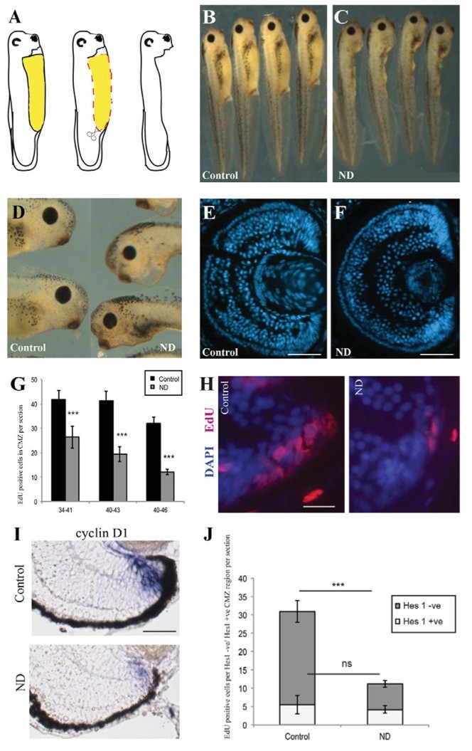 Fig. 1. Nutrient deprivation causes a decrease in CMZ proliferation. (A) The nutrient deprivation (ND) procedure. The yolk-rich gut (yellow area), which feeds the embryo, was removed by dissection (red dashed line), leaving the animal in a nutrient- deprived state. Xenopus ND embryos appeared developmentally and morphologically normal 2 days after yolk dissection when compared with control animals (B), but were smaller (C) with smaller eyes (D; control on left, ND embryo on right). (E,F) The cross-sectional area of the whole retina was reduced after ND. ND also reduced the size of the ciliary marginal zone (CMZ) (H) and decreased CMZ proliferation as measured by EdU incorporation after a 2-hour pulse (G,H). In G, embryos were nutrient-deprived during the stages shown. n=10-20 retinas per condition. (I) ND decreases both the domain and intensity of cyclin D1. (J) ND significantly decreased EdU incorporation in progenitor (Hes1 negative) cells but did not affect proliferation in the Hes1-positive stem cell population. n=3, 12 embryos/condition. (G,J) Error bars show 95% confidence intervals; ***Pâ¤0.001 (unpaired t-test); ns, not significant. Scale bars: 100 μm (E,F); 50 μm (H,I).