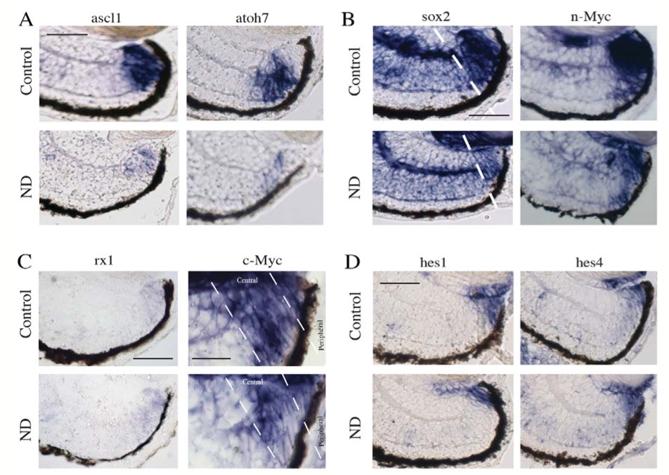 stem/progenitor cells. (A) Proneural gene expression levels decreased following ND, as did levels of the progenitor markers sox2 and n-Myc (B). Dashed line in B indicates the central domain of the CMZ. n=8, 32 embryos/condition. (C) Expression of the eye field transcription factor gene rx1 remained unchanged. n=4, 16 embryos/condition. (C) c-Myc gene expression levels remained unchanged; however, the domain of c-Myc gene expression was reduced in the central CMZ of ND embryos. n=8, 32 embryos/condition. (D) Expression levels of the stem cell marker genes hes1 and hes2 remained unchanged in ND conditions. n=4, 16 embryos/condition. Scale bars: 50 μm (A,B,D); 50 μm (C; rx1) 25 μm (C; c-Myc).
