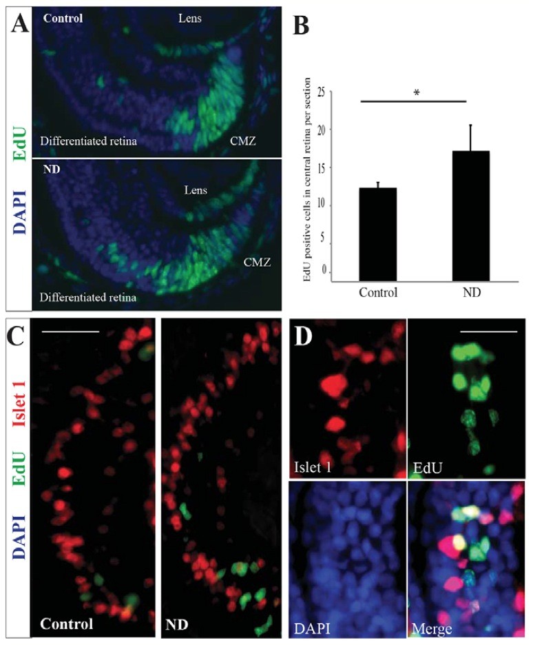 Fig. 3. Committed progenitor cells continue to differentiate normally following ND. (A) Many cells labelled with EdU 20 minutes prior to ND were found in the differentiated central retina after a 3-day chase period. n=3, 12 embryos/condition. (B) These cells increased in number in the ND condition compared with control retinas. n=3, 12 embryos/condition. Error bars show 95% confidence intervals; *Pâ¤0.05 (unpaired t-test). (C,D) High magnification of the central retina, which contains differentiated cells. Some EdU-labelled cells were also positive for the neuronal marker Islet1, which marks specific subsets of amacrine and bipolar cells in the inner nuclear layer of the differentiated retina. n=3, 12 embryos/condition. Scale bars: 40 μm (C); 10 μm (D).