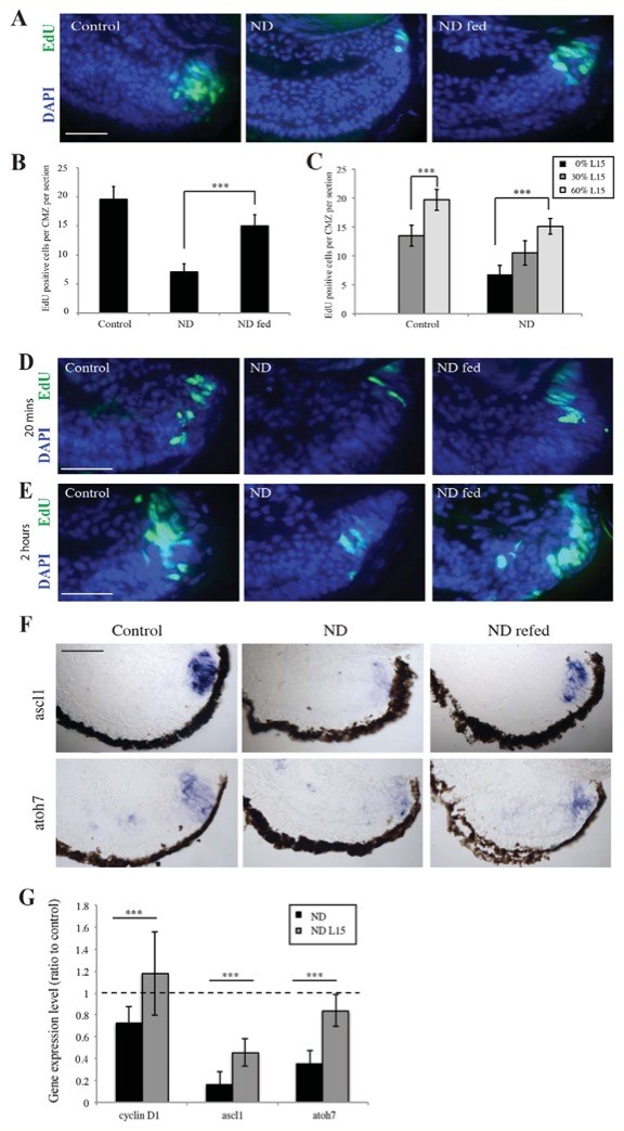(C) This increase in proliferation varied with nutrient levels, suggesting that nutrients can regulate proliferation within a dynamic range. n=3, 18 retinas/condition. (D,E) Proliferation was initiated in the CMZ as early as 20 minutes after re-feeding (D), with robust proliferation being observed 2 hours after the addition of nutrients (E). (F,G) After culture for 24 hours in L15, a strong upregulation of Cyclin D1 and the proneural genes ascl1 and atoh7 was observed in re-fed retinas. n=3, 18 retinas/condition. (B,C,G) Error bars show 95% confidence intervals; ***Pâ¤0.001 (unpaired t-test). Scale bars: 50 μm (A,D,E,F).