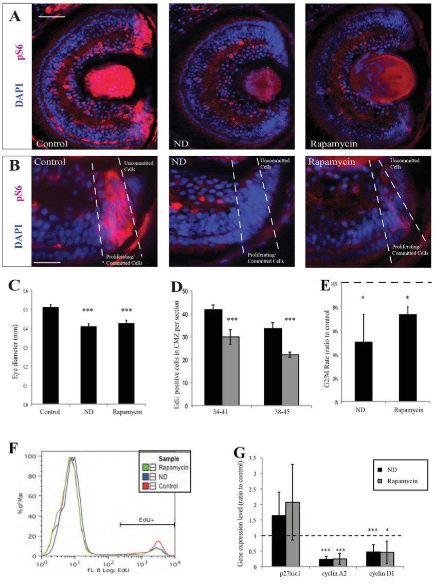 (D) Rapamycin treatment during stages 38-45 significantly reduced the number of proliferative cells in the CMZ. n=5-12 retinas. (E,F) ND or rapamycin reduced the fraction of G2/M cells that were EdU positive after a short EdU pulse (E), suggesting G2/M slowdown, and reduced the overall percentage of EdU- positive cells in the retina (F) from 13% in controls to 9% in rapamycin-treated and 7% in ND embryos. n=3 experiments. (G) Expression levels for the cell cycle genes cyclin D1, cyclin A2 and p27Xic1. ND and rapamycin expression levels are shown as ratio to control. n=6, 24 embryos/condition. (C-E,G) Error bars show 95% confidence intervals; ***Pâ¤0.001, *Pâ¤0.05 (unpaired t-test). Scale bars: 100 μm (A); 50 μm (B).