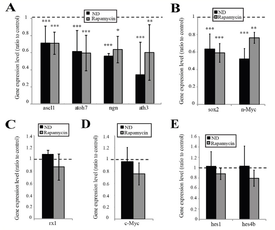 the progenitor markers sox2 and n-Myc (B). n=8, 32 embryos/condition. (C) Expression of the eye field transcription factor gene rx-1 remained unchanged by ND. n=4, 16 embryos/condition. (D) c-Myc expression levels remained unchanged; however, the domain of c-Myc expression was reduced in the central CMZ of ND and rapamycin-treated embryos. n=8, 32 embryos/condition).