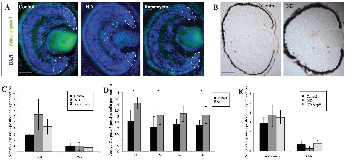 ND and Rapamycin treatment for two days does not result in increased CMZ cell death indicated by active caspase 3 staining (A) or TUNEL (B), however the number of apoptotic cells was increased in the differentiated retina (C). (D) Apoptosis was initially slightly higher in the retina at 12, 24 and 48 hours after ND when compared to controls. (E) bpV treatment did not affect the number of active caspase 3 positive cells. All error bars show 95% C.I. *p=<0.05. (n=3, 12 retinas/condition). Scale bars = 100μm