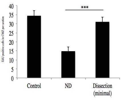 Sup.Fig.3 Decreased proliferation after ND is not due to injury: Minimal dissection with less than 25% of the yolk removed does not impair proliferation, n= 8-13 embryos, 2 hour EdU pulse, dissection from St. 35 to St. 42., ***p< 0.001.