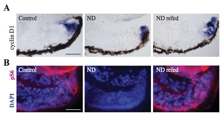 (A) After culture for 24 hours in 60% L15 a statistically significant upregulation of Cyclin D1 was observed in refed retinas. (B) Re-feeding with 60% L15 results in the reactivation of mTOR signalling in the CMZ as indicated by increased pS6 expression specifically in the proliferating progenitor cells. Scale bars = 50μm