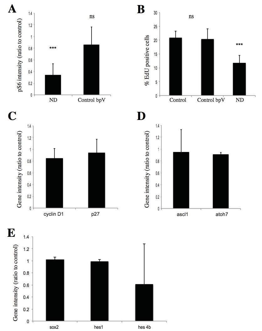 (A) Treatment with bpV did not significantly change pS6 levels in control retinas (n=4, 12 embryos/condition). Error bars show 95% C.I. Unpaired t test -***p=<0.001, **p=<0.01, *p=<0.05. (B) Levels of EdU incorporation were not significantly different to controls (n=4, 12 embryos/condition). Error bars show 95% C.I. Unpaired t test. (C) Expression of cell cycle regulators, proneural genes (D) and progenitor/ stem cell markers (E) was not affected by bpV treatment in control retinas.
