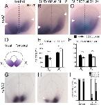 Figure 5. Inhibition of Fgfrs during the eye field stage results in expansion of dorsal markers in the nasal retina. AâC: Representative images of tbx3 expression in the eyes of Stage 32 embryos exposed to control or SU5402 solutions for 5 hr at Stage 12 (A, B), or Stage 24 (C). The ventral boundary of expression domains is indicated (arrowheads). D: The distance from the ventralretina to the ventral boundary of the tbx3 or bmp4 expression domains in the nasal (X-N) and temporal (X-T) retina was measured in control- and Fgfr inhibitor-treated embryos. E, F: The tbx3 expression domain is expanded in the nasal retina (therefore the distance to the base of the domain is diminished) and unchanged in the temporal retina after SU5402 treatment at Stage 12 (E; N=4 experiments with a minimum 8 embryos/group), and unchanged in both the nasal and temporal retina after treatment at Stage 24 (F; N=3 experiments with a minimum of 8 embryos/group). G, H: Lateral view of the eyes of Stage 32 embryos treated with a control or SU5402 solution at Stage 12. I: The bmp4 domain is expanded in the nasal retina and unchanged in the temporal retina (bmp4, N=2 experiments with a minimum of 7 embryos/group). Values in graphs are mean distanceâ±âSEM; means were compared using unpaired t-tests. *Pâ<â0.05, **Pâ<â0.01). Grey dashed line in A, B, C, G, H indicates the outline of the developing neural retina, and the black dashed line divides the retina into nasal and temporal halves.Download figure to PowerPoint