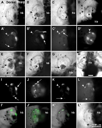 Figure 2. AâLâ²: Dorsal third ablations have less severe phenotypes than dorsal half ablations. Dorsal views of inner ears in living tadpoles at approximately stage 47â48. AâL: Twelve examples of dorsal one-third ablations (Dorsal Third on the figure), ventral two-thirds remaining. AâH,Lâ²: Bright field images. Aâ²âDâ²,IâL: Fluorescent images. Iâ²-Kâ²: Overlay of fluorescence and bright field images. A,Aâ²: Abnormal semicircular canal (black arrowhead) with nearly normal sensory organs, including posterior crista (white arrow). (B,C) Nearly completed semicircular canal formation (black arrowheads) but with abnormal fused otolith (black arrows). Bâ²: Smaller posterior cristae with labeled hair cells in saccular macula (white arrow). Câ²: Nearly normal pattern of sensory organs although smaller, like utricular macula (white arrow). D,Jâ²: Abnormal semicircular canals (black arrowhead) and single fused otolith (black arrow). Dâ²,J: Sensory organs somewhat patterned, although smaller with ectopic hair cells, white arrow points to anterior crista. Aâ²-Dâ²,I,K,L: White arrowheads point to lateral cristae. (Aâ²,K,L) White arrows point to posterior cristae. EâG: Brightfield images of ears with increasingly severe phenotypes. E: Nearly normal semicircular canals (black arrowhead) and otoliths (black arrow). F: Nearly normal semicircular canals (black arrowhead) with abnormal fused otolith (black arrow). G,H: Abnormal canals (black arrowhead) and otolith (black arrow). I,Iâ²,K,Kâ²: Normal pattern of sensory organs but reduced in size, especially in K, and abnormal otoliths. I: Upper white arrow points to saccular macula, lower white arrow points to posterior crista. (L,Lâ²) Nearly normal sensory organ pattern and otoliths. B,C,Aâ²âCâ²,EâG: These images are extended focus composites of at least 2 different focal planes using the extended depth of field plugin (see Methods). White arrowheads point to the lateral cristae. Anterior is to the top of all images except D and G where anterior is to the top right. Abbreviations: um, utricular macula; hb, hindbrain. Scale bars = 500 μm with bar in Lâ² applying to all panels but H.Download figure to PowerPoint
