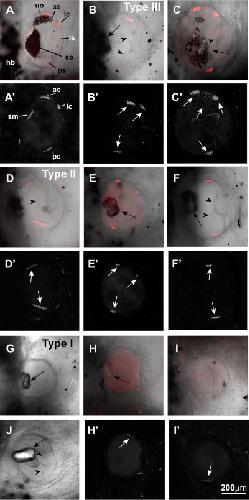 Figure 4. AâIâ²: Inhibiting Canonical Wnt signaling results in three main phenotypes. Dorsal views of inner ears in living tadpoles at approximately stage 45â47. A: The uninjected control ear. B,C: Two different examples of the least severe, Type III (Indicated on the figure), phenotype. DâF: Three examples of intermediate, Type II (Indicated on the figure), phenotype. GâJ: Four examples of the most severe, Type I (Indicated on the figure), phenotype. AâJ: DIC images. Aâ²âFâ²,Hâ²,Iâ²: Fluorescent images. Black arrows point to otoliths. Black arrowheads point to incomplete invaginations that would have formed semicircular canals. White arrows point to labeled hair cells. All images collected with confocal microscope using a two-photon laser. Fluorescent images are projections of multiple planes of focus using the extended depth of field plugin (see Methods). hb, hindbrain; as, anterior semicircular canal (scc); ls, lateral scc; ps, posterior scc; uo, utricular otolith; so, saccular otolith; ac, anterior crista; lc, lateral crista; pc, posterior crista; um, utricular macula; sm, saccular macula. Scale bar = 200 μm.Download figure to PowerPoint