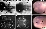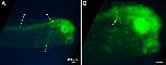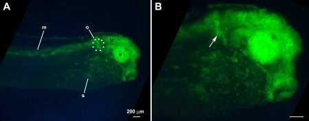 Figure 6. Expression of fluorescently tagged β-catenin morpholino. A: Lateral view of stage 33/34 tadpole injected on one side at two cell stage showing morpholino containing tissues which include the inner ear (o; outlined by white dots), eye (e), brain (b), epidermal skin (s), muscle cells (m). B: Higher magnification view of same tadpole. Arrow indicates labeling in inner ear, highlighting stronger staining in dorsal to ventral stripe down center of otocyst. Scale bar = 200 μm. Download figure to PowerPoint.