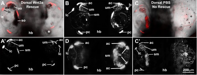 Figure 5. AâD: Wnt3a rescue of dorsal half ablation. Dorsal views of intact living tadpoles at stage 48. Fluorescent confocal Images (Aâ²,B,Câ²,D) and brightfield images overlaid with red fluorescence (A,C) Control unoperated side on left, bead recipient right (stage 48). A,Aâ²,B: Two examples of bead recipients with full rescue. C,Câ²: PBS soaked bead recipient with no rescue of dorsal ablation on right side. D: Bead recipient with a mirror anterior duplication. Asterisk indicates bead still present at tadpole stage. Fluorescent confocal images are maximum intensity projections of multiple planes of focus. hb, hindbrain; as, anterior semicircular canal (scc); ls, lateral scc; ps, posterior scc; uo, utricular otolith; so, saccular otolith; ac, anterior crista; lc, lateral crista; pc, posterior crista; um, utricular macula; sm, saccular macula. Scale bar = 200 μm.Download figure to PowerPoint