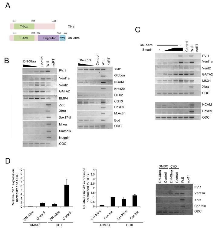 Fig. 3. Xbra directly induces PV.1 expression. (A) Schematic representation of Xbra and DN-Xbra. Xbra and DN-Xbra have a DNA-binding domain (T-box), but DN-Xbra has an engrailed repressor domain instead of a transcriptional activation domain in the C-terminal region. (B) DN-Xbra RNA (2, 1, or 0.5 ng) was injected at the one-cell stage. Ectodermal explants were dissected at stage 8 and incubated until stage 11 or 24. The relative gene expression was analyzed by RT-PCR. (C) Smad1 RNA (2, 1, or 0.5 ng) and DN-Xbra RNA (2 ng) were co-injected at the one-cell stage. Ectodermal explants were dissected at stage 8 and incubated until stage 11 or 24. The relative gene expression was analyzed by RT-PCR. (D) DN-Xbra RNA (2 ng) was injected at the one-cell stage. Ectodermal explants were dissected at stage 8 and incubated in animal cap media containing CHX (5 ng/ml) until stage 11 or 24. The relative gene expression was analyzed by RT-PCT. Noggin, dorsal mesoderm marker; Mixer, Sox17b, and Edd, endoderm markers; Xk81, epidermis marker; globin, blood marker; CG13, cement glad marker. The data are shown as the means ± the S.D.s of the values of at least three independent experiments. Differences were considered significant at Pï¼ 0.05.