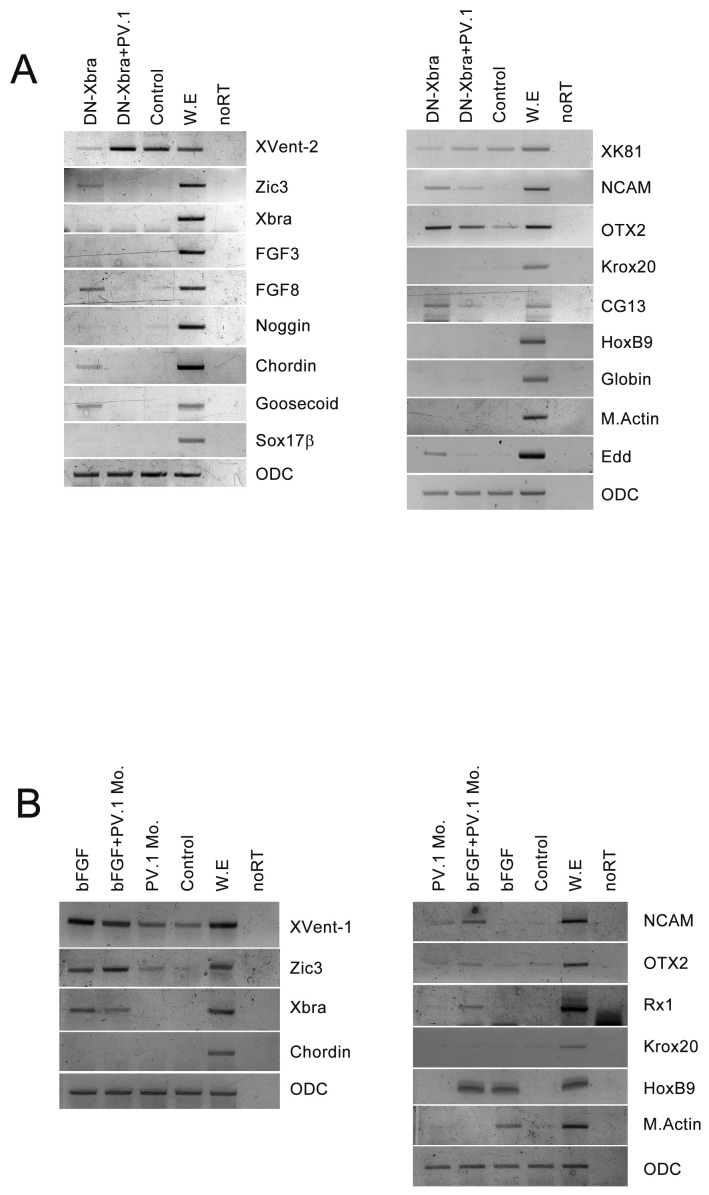 Fig. 4. The knockdown of PV.1 induces neurogenesis in bFGF-treated ectodermal explants. (A) PV.1 RNA (0.5 ng) and DN-Xbra RNA (2 ng) were co-injected at the one-cell stage. Ectodermal explants were dissected at stage 8 and incubated until stage 11 or 24. The relative gene expression was analyzed by PCR. (B) Anti-sense morpholino oligos of PV.1 (20 ng) were injected at the one-cell stage. Ectodermal explants were dissected at stage 8 and incubated in animal cap media containing bFGF (50 ng/ml) until stage 11 or 24. The relative gene expression was analyzed by RT-PCR.