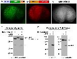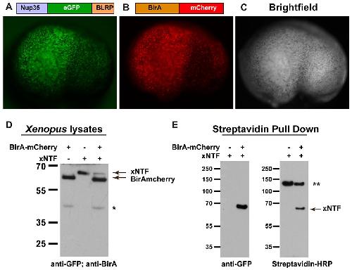 Fig. 1. Affinity isolation of biotin-tagged proteins from Xenopus embryos. (A-C) Schematic of Nup35::eGFP::BLRP(xNTF) and BirA::mCherry fusion proteins, and corresponding images of a Xenopus embryo co-injected at the one-cell stage with capped mRNA coding for each fusion. Lateral view of a stage 23 embryo with anterior to the left and dorsal up. (D) Western blot analysis of embryos injected individually and together with xNTF and BirA::mCherry shows that the proteins are of the correct size. xNTF was detected with anti-GFP antibodies, and BirA was detected by anti-BirA antibodies. (E) Immunoprecipitation of xNTF with streptavidin-conjugated beads, followed by western blot analysis shows that xNTF is efficiently isolated from embryos by probing with anti-GFP or streptavidin-HRP. *A potential translation product of BirA::mCherry corresponding to the size of BirA protein alone. **Endogenously biotinylated proteins isolated by streptavidin. |