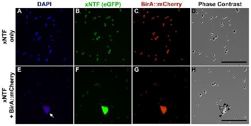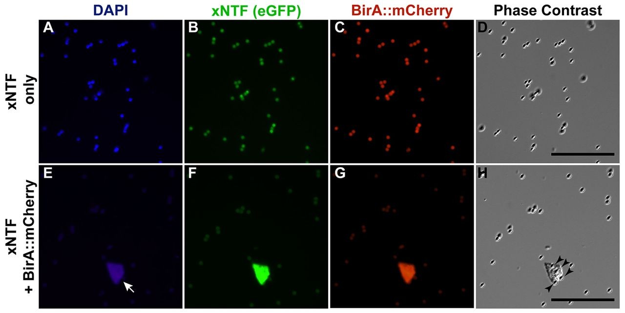 Fig. 2. Affinity isolation of xNTF-tagged nuclei. Streptavidin-coated magnetic beads incubated with nuclei from embryos injected with mRNA encoding xNTF with or without BirA::mCherry. (A-D) Fluorescent DAPI (A), xNTF (eGFP; B), BirA::mCherry (Texas Red; C) and phase-contrast (D) images of magnetic beads after nuclear purification of xNTF in the absence of BirA. Autofluorescing beads are detectable throughout the field, but no nuclei. (E-H) Fluorescent DAPI (E), eGFP (F), Texas Red (G) and phase-contrast (H) images of magnetic beads after nuclear purification of xNTF. Note the presence of eGFP and BirA::mCherry-positive nucleus (arrow) and presence of magnetic beads coating nucleus (arrowheads). Scale bars: 50 μm. |