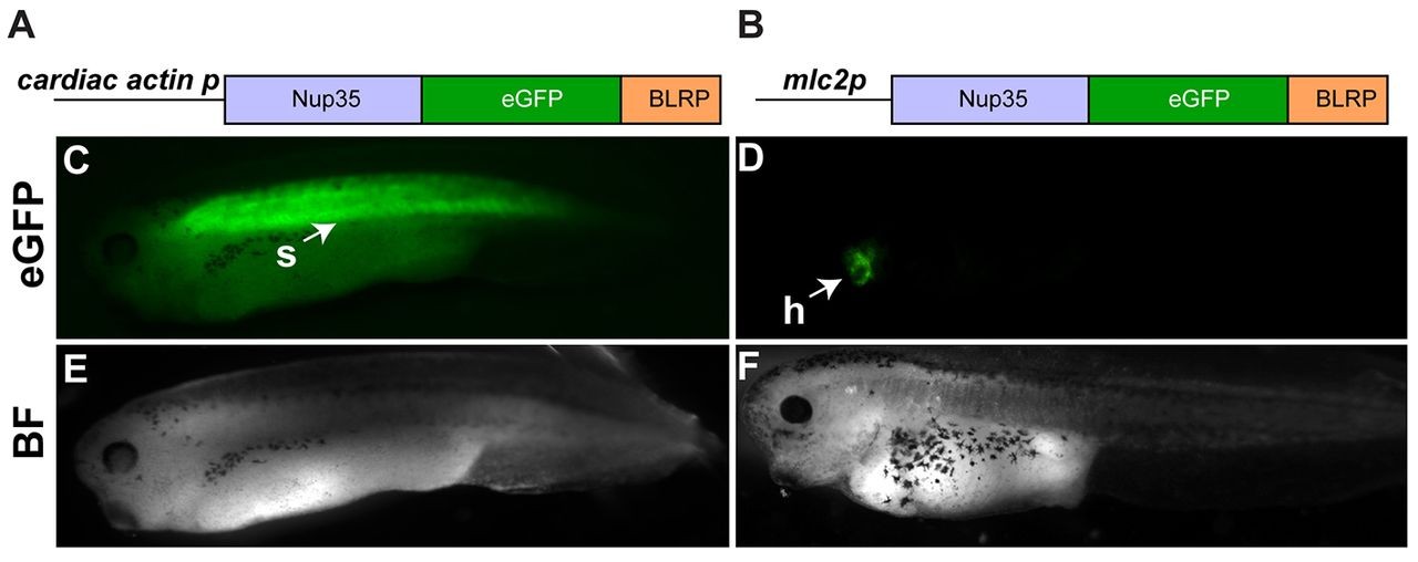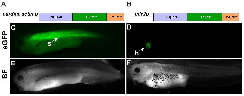 Fig. 3. Generation of transgenic embryos expressing xNTF. (A,B) Schematics of constructs used to generate transgenic embryos expressing xNTF in the striated muscle and myocardium (A) and the myocardium only (B). (C-F) Representative images of stage 38 (C,E) and stage 40 (D,F) embryos harboring the respective transgenes. Embryos express xNTF (eGFP) in the expected pattern (C,D), and appear morphologically normal (E,F). eGFP in myocardium is fainter than staining in somites and masked by autofluorescence of the gut in C. Images shown are lateral views with anterior to the left and dorsal up. BF, bright field; h, heart; s, somites. |