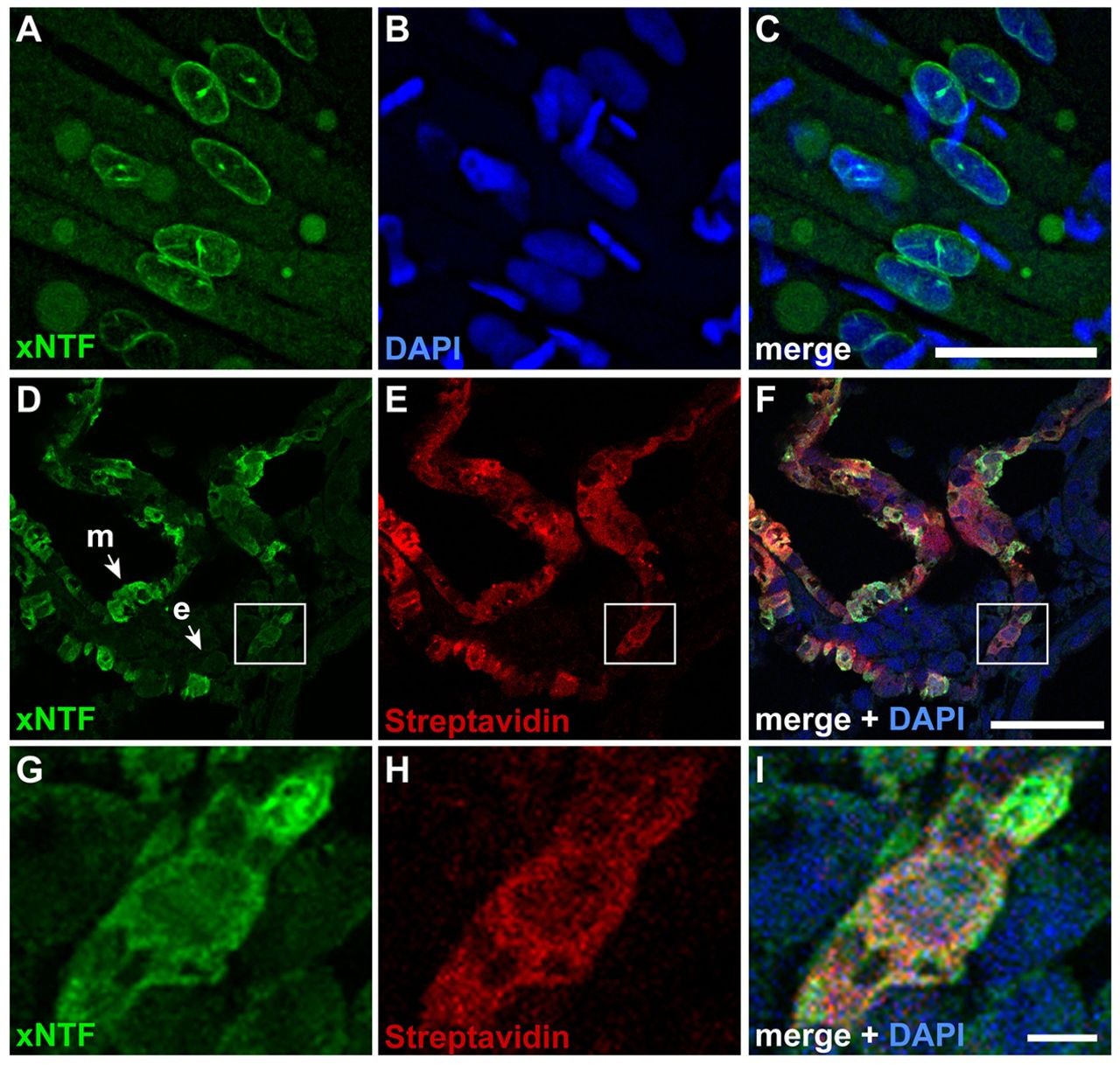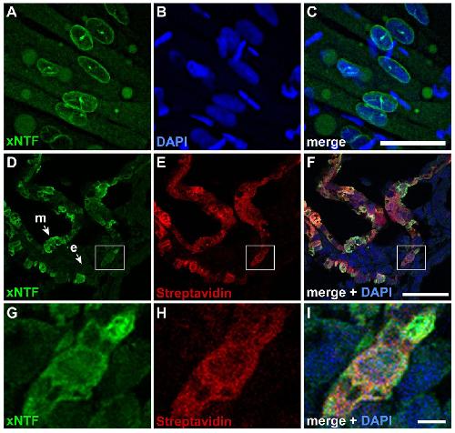 Fig. 4. Demonstration of xNTF localization and biotin tagging in transgenic animals. (A-C) xNTF localization in the somites as detected by eGFP (A); nuclei were marked with DAPI (B) and the merged image is shown in C. Images are from whole embryos with anterior to the left and dorsal up. (D-F) Transverse sections through the heart (dorsal is up) show expression of xNTF (D) in the myocardium (m) but not the endocardium (e), and corresponding localization of biotinylated xNTF as detected by streptavidin (E). Images were overlaid with DAPI to show the nuclei in F. (G-I) Magnified image of the boxed region in D-F. Scale bars: 200 μm (C); 50 μm (F); 5 μm (I). |