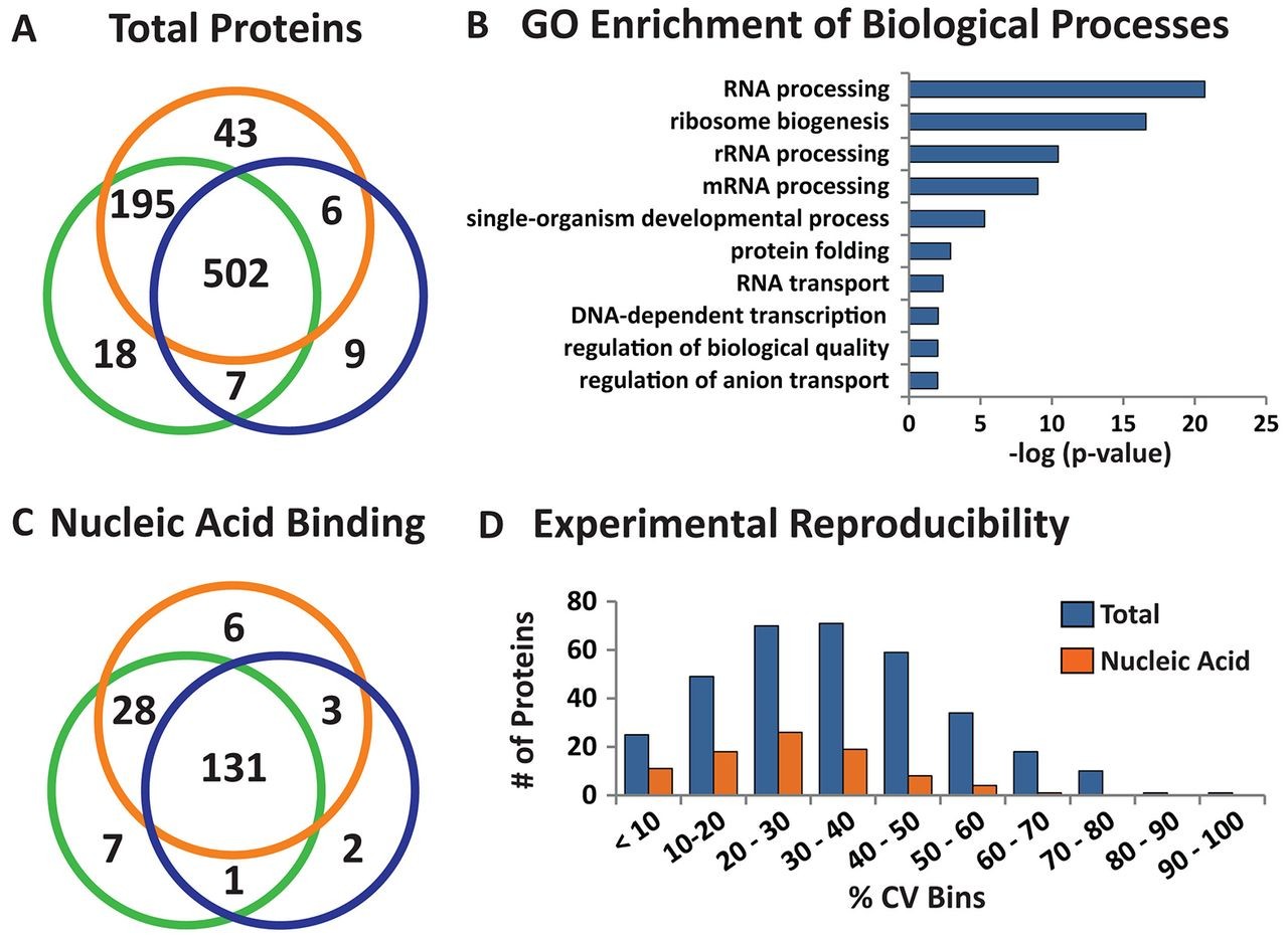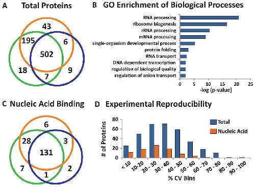 Fig. 6. Proteomic profiling of INTACT-enriched Xenopus cardiomyocyte nuclei. (A) Venn diagram comparison of the total proteins identified in three biological replicates (n=781). (B) g:profiler biological process gene ontology enrichment analysis. Only terms that were significant versus the annotated Xenopus tropicalis genome are shown (-log(P-value) >2). (C) Venn diagram comparison of proteins identified with �nucleic acid binding� molecular function gene ontology (n=178). (D) Distribution of weighted spectral count percentage coefficient of variation (% CV, n=3). % CV was calculated for shared proteins identified in A and C, corresponding to total proteins (blue bars) and nucleic acid-binding proteins (orange bars) with at least three weighted spectral counts in all biological replicates. |