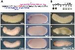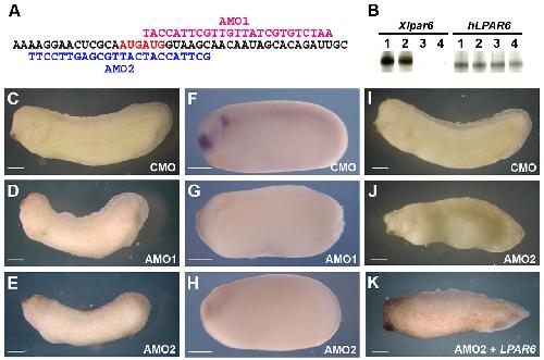 Fig. 4. LPAR6 is required for forebrain development. (A) Sequence (black letters, 5â²-3â²) of Xenopus lpar6 mRNA (translational start site in red) aligned with sequence for both AMO1 (pink letters 3â²-5â²) and AMO2 (blue letters 3â²-5â²). (B) In vitro translation of Xenopus lpar6 and human LPAR6 in the presence of morpholinos. Lane 1, no MO. Lane 2, control MO. Lane 3, AMO1. Lane 4, AMO2. (C-E) Stage 28, lateral view (head to left), injected with 40 ng of morpholino. (C) Normal embryo injected with control MO (100%, n=90). (D) AMO1-injected embryo with head defect (60%, n=95). (E) AMO2-injected embryo with head defect (93%, n=75). Anteroposterior axis length of control-MO-injected embryos was 4.0 mm (s.d.=0.21, n=44) and that of AMO-injected embryos 3.4 mm (s.d.=0.17, n=44). Defects in D and E are statistically significant (Fisherâs exact test, P<0.001). (F-H) Whole-mount in situ hybridisation, with antisense foxg1 probe. Stage 24, lateral view (head to left), injected with 40 ng of morpholino. (F) Normal embryo injected with control MO (100%, n=30). (G) AMO1-injected embryo with reduced foxg1 expression (60%, n=30). (H) AMO2-injected embryo with reduced foxg1 expression (87%, n=30). Defects in G and H are statistically significant (Fisherâs exact test, P<0.001). (I-K) Stage 28, lateral view (head to left), injected with 40 ng of AMO2 and 400 pg of human LPAR6 mRNA. (I) Normal embryo injected with control MO (100%, n=30). (J) AMO2-injected embryo with head defect (80%, n=35). (K) AMO2 plus hLPAR6 mRNA-injected embryo with normal head (66%, n=35). Rescue of head development in K is statistically significant (Fisherâs exact test, P<0.001). Scale bars: 400 μm.
