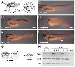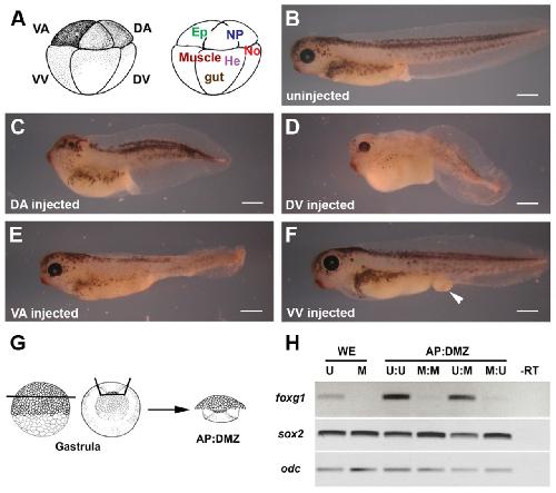 Fig. 7. LPAR6 is required in the ectoderm. (A) Schematic diagrams of an eight-cell Xenopus embryo, indicating injected blastomere pairs and their normal fate. (B-F) Stage 40 embryos, lateral view (head to left), injected with 5 ng per blastomere of AMO2. (B) Uninjected normal embryo (n=50). (C) DA injected embryo with head defect (86%, n=69). (D) DV injected embryo with dorsal defect but a normal head (61%, n=54). (E) VA injected embryo with tail defect but a normal head (76%, n=66). (F) VV injected embryo with defect in the posterior endoderm (arrowhead) but a normal head (60%, n=60). All defects are statistically significant (Fisherâs exact test, P<0.001). (G) Schematic diagram of animal pole (AP) and dorsal marginal zone grafts. (H) RT-PCR analysis for foxg1, sox2 and odc expression in AP:DMZ grafts. Grafts were made between uninjected (U) and AMO2-injected (M) fragments. Scale bars: 500 μm. -RT, minus reverse transcriptase control, uninjected stage 19 embryos; AP, animal pole; DA, dorsal-animal; DV, dorsal-vegetal; Ep, epidermis; He, heart; M:M, AMO2-injected AP and AMO2-injected DMZ; M:U, AMO2-injected AP and uninjected DMZ; No, notochord; NP, neural plate; U:M, uninjected AP and AMO2-injected DMZ; U:U, uninjected AP and uninjected DMZ; VA, ventral-animal; VV, ventral-vegetal; WE, stage 19 embryo.