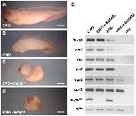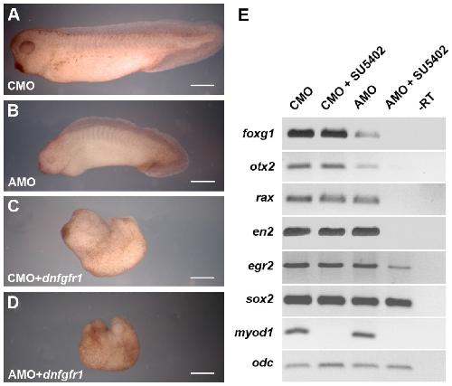 Fig. 8. LPAR6 and FGF co-regulate neural development. (A-D) stage 32, lateral view (head to left), injected with 40 ng per blastomere of MO plus or minus 1 ng of dominant-negative FGFR1 (dnfgfr1) mRNA. (A) Normal embryo injected with control MO (100%, n=27). (B) AMO2-injected embryo with head defect (81%, n=37). (C) Control MO plus dnfgfr1-injected embryo with posterior defect but normal head (92%, n=25). (D) AMO2 plus dnfgfr1-injected embryo with both head and posterior defects (100%, n=28). Note that the head defect is more severe than with AMO alone. All defects are statistically significant (Fisherâs exact test, P<0.001). (E) RT-PCR analysis of MO-injected embryos incubated with or without 10 μM SU5402, from stage 9 to stage 16. Embryos were analysed for expression of the foxg1 and otx2 (forebrain), rax (eyefield), en2 (MHB), egr2 (hindbrain), sox2 (neural plate), myod1 (skeletal muscle) and odc (control). Scale bars: 500 μm. -RT, control-morpholino-injected embryos.
