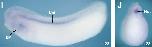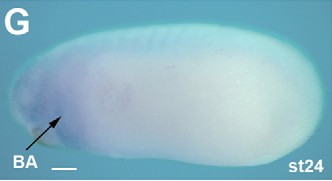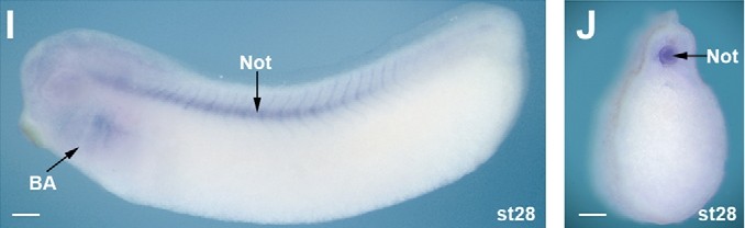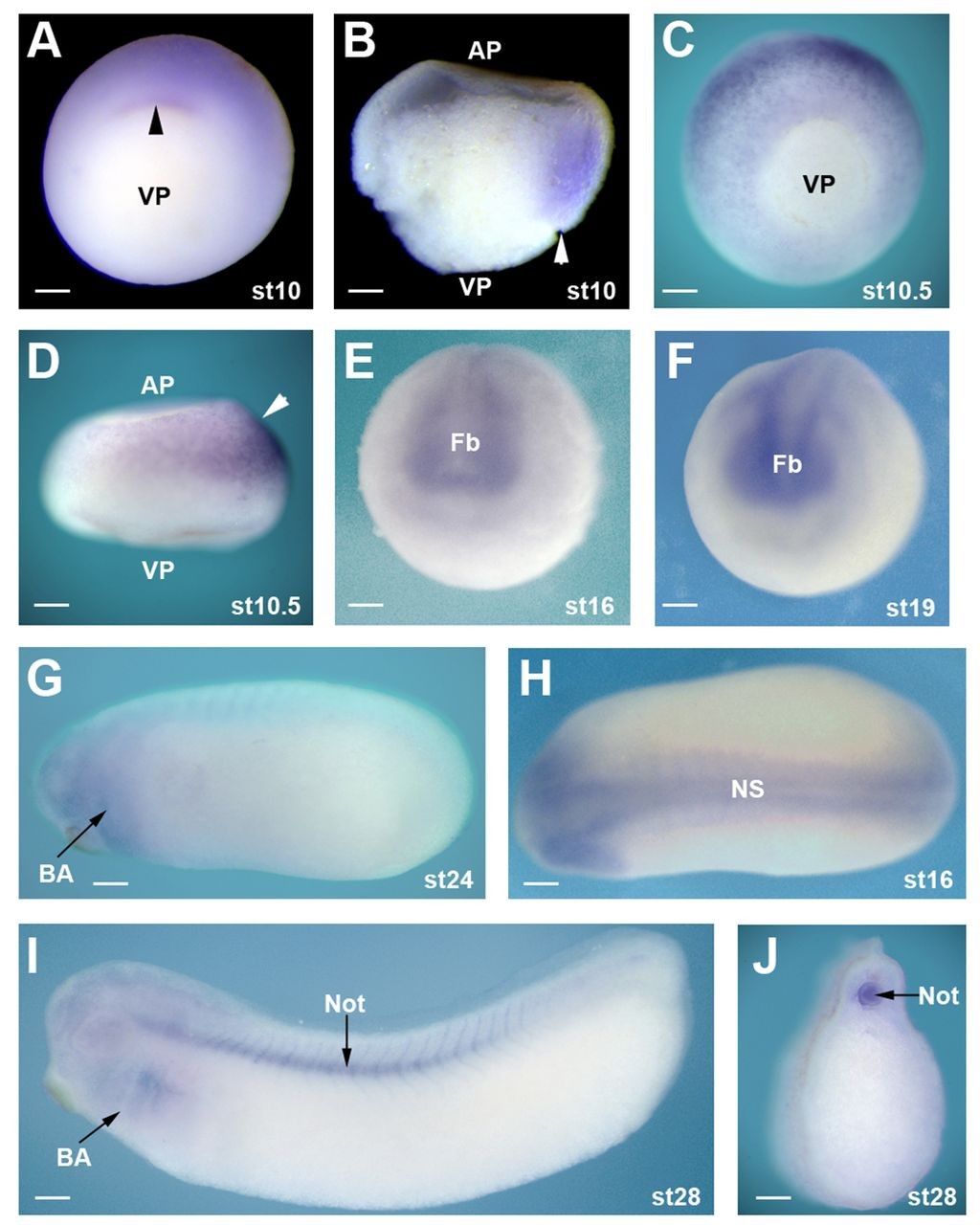 Fig. 2. Spatial expression of lpar6. Whole-mount in situ hybridisation with antisense probe for lapr6. (A) Stage 10, vegetal view, with dorsal blastopore lip (arrowhead). (B) Stage 10, bisected, with dorsal blastopore lip (arrowhead). (C) Stage 10.5, vegetal view. (D) Stage 10.5, lateral view, with dorsal-animal expression (arrowhead). (E) Stage 16, anterior view. (F) Stage 19, anterior view. (G) Stage 24, lateral view with head to the left. (H) Stage 16, dorsal view with head to the left. (I) Stage 28, lateral view with head to the left. (J) Stage 28, trunk section. Scale bars: 200 μm. AP, animal pole; BA, branchial arch; Fb, forebrain; Not, notochord; NS, nervous system; VP, vegetal pole.