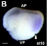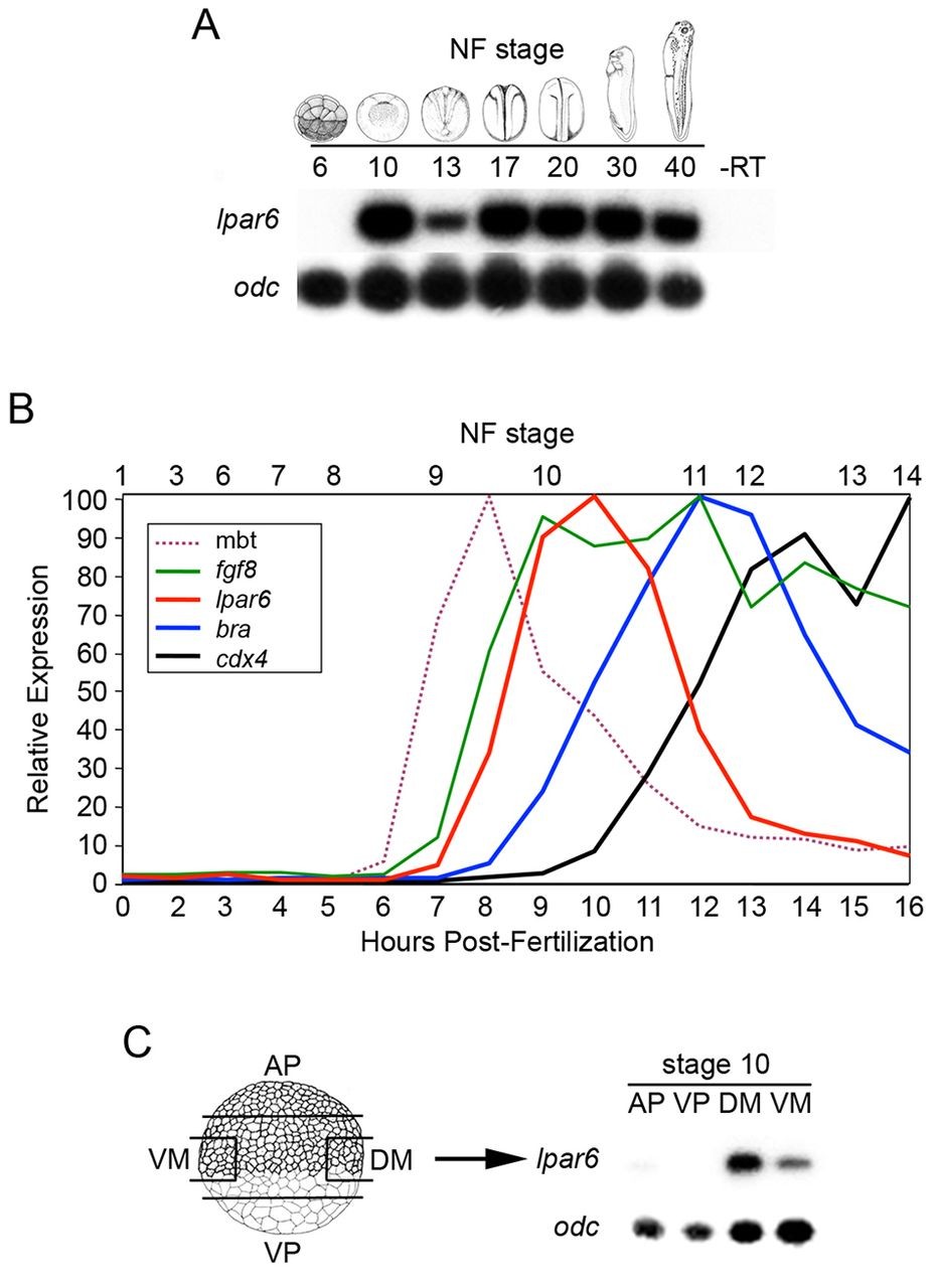 Fig. 1. Temporal expression of lpar6. (A) RT-PCR analysis for lpar6 and ornithine decarboxylase (odc) in staged Xenopus embryos, showing lpar6 expression from stage 10 (early gastrula) to stage 40 (tadpole). Note the drop in expression at stage 13 (late gastrula). Minus reverse transcriptase control (-RT) was performed at stage 40. (B) Microarray analysis for expression of lpar6, fgf8, bra, cdx4 and a marker for the mid-blastula transition (MBT). Xenopus embryos were collected 0-16 hours post-fertilisation (23°C). (C) RT-PCR analysis for lpar6 and odc in dissected stage 10 embryos. AP, animal pole; DM, dorsal marginal zone; VM, ventral marginal zone; VP, vegetal pole.