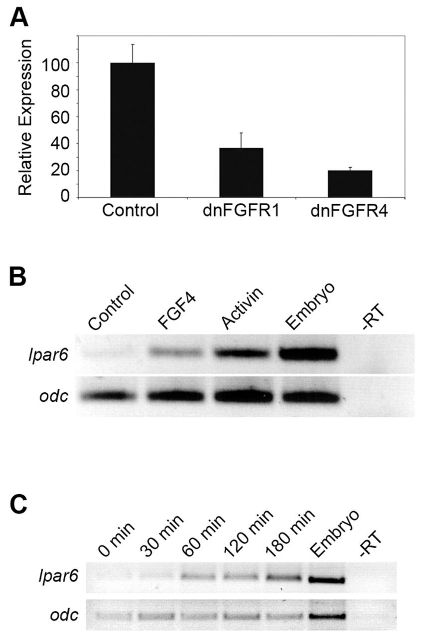 Fig. 3. FGF regulates expression of lpar6. (A) Microarray analysis for lpar6 transcripts in early gastrulae expressing dnFGFR1 or dnFGFR4. (B) RT-PCR analysis for lpar6 and odc in animal caps incubated for 5 hours (18°C) with either FGF4 or Activin. Sibling embryos were used for embryo and -RT controls. (C) RT-PCR analysis for lpar6 and odc in animal caps incubated with FGF4 for up to 180 minutes (18°C). Sibling embryos were used for whole embryo and -RT controls.